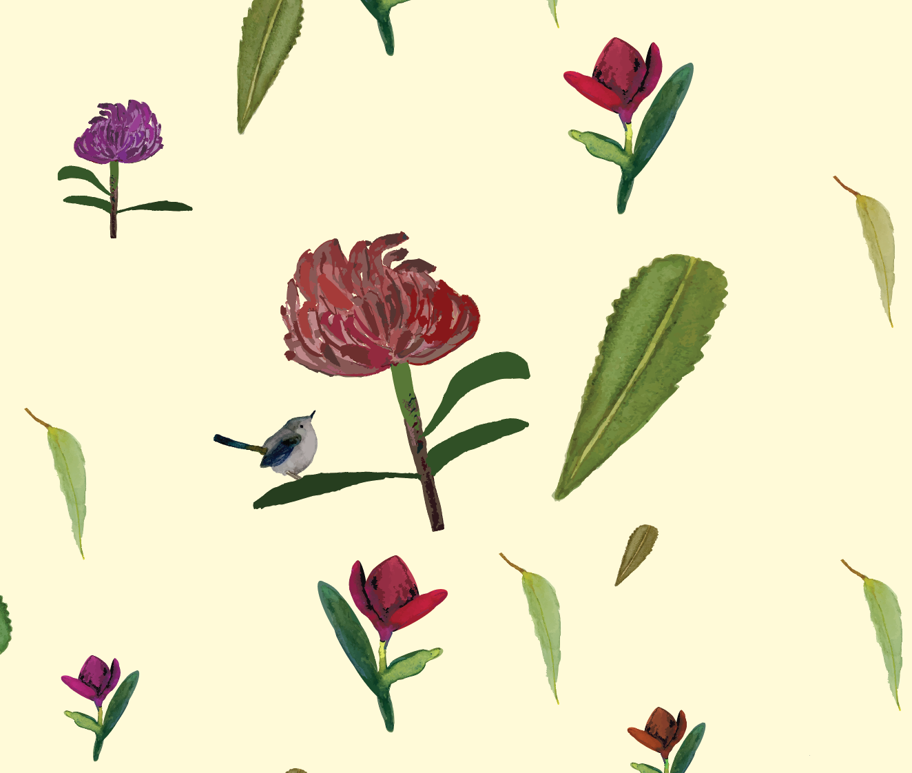 The Australian Waratah and finches amongst fallen leaves. Inspired by the Australian bush.